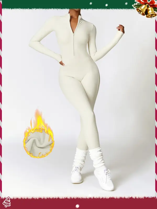 Women's Solid Zip Up Skiing Jumpsuit, Casual Sporty Long Sleeve Jumpsuit for Skiing Cycling, Ladies Sportswear for Fall & Winter