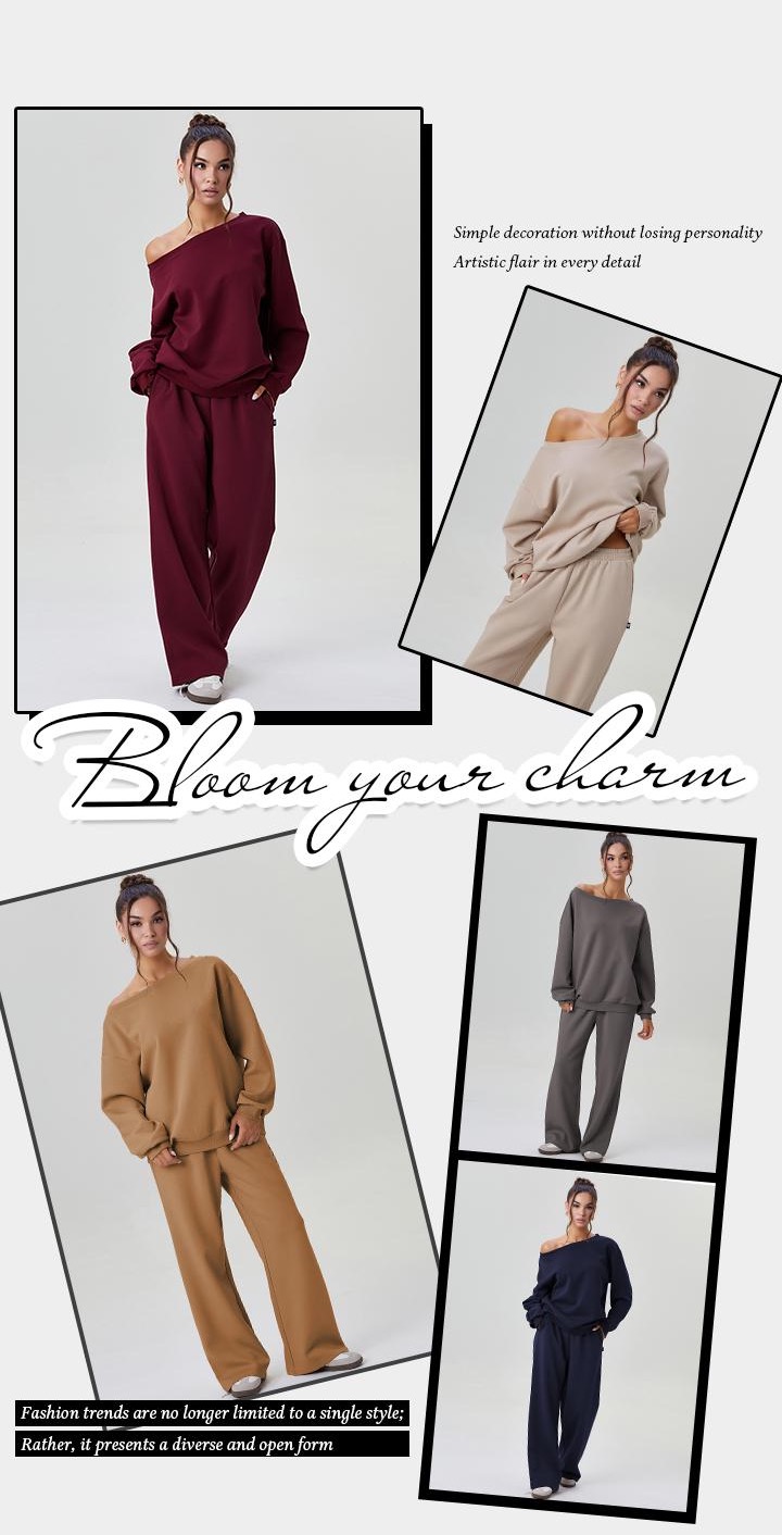 Made from soft, solid-colored fabric, this set features a stylish sloping shoulder design and long sleeves, paired with matching trousers for an elegant appearance. ·Material:95%Polyester+5%Elastane